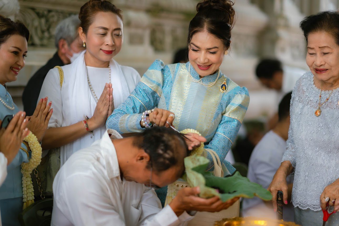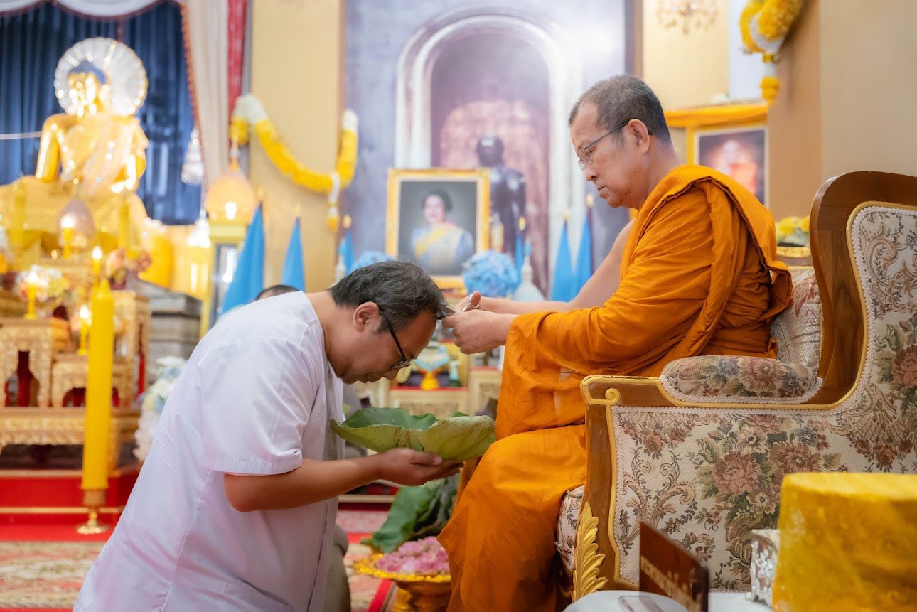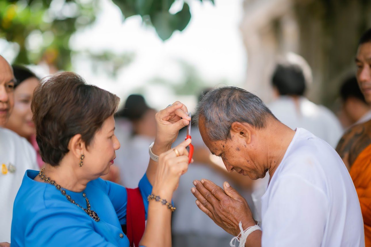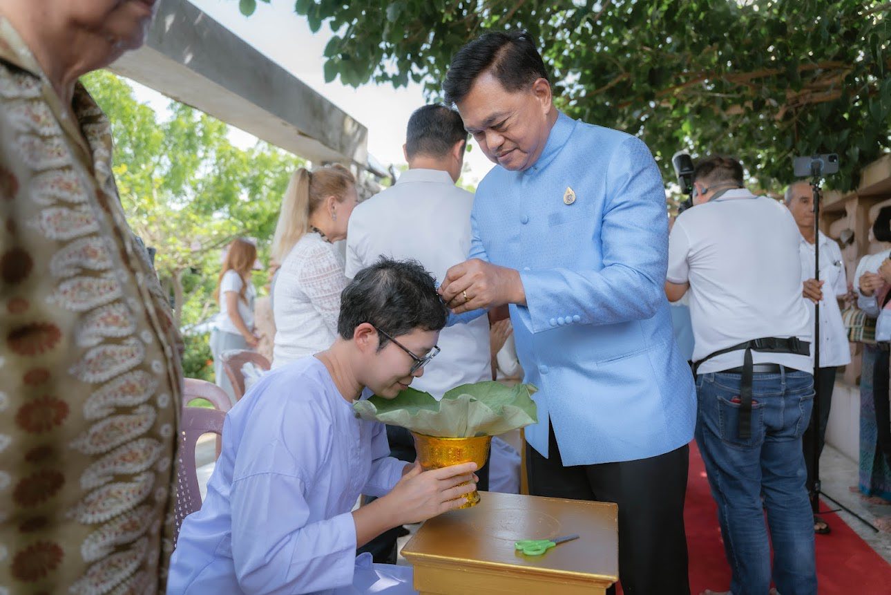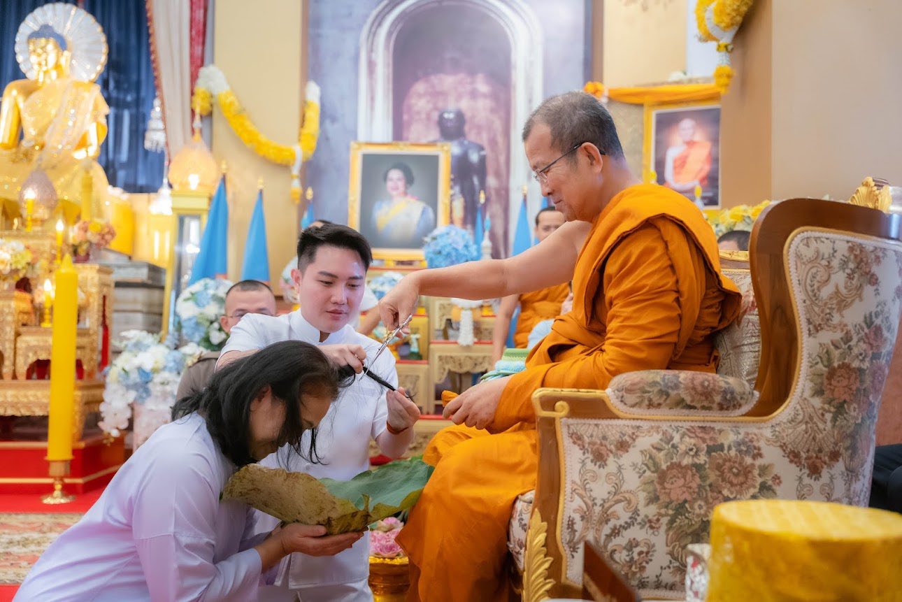 โดยมี ดร.ไพลิน เทียนสุวรรณ ที่ปรึกษารัฐมนตรีว่าการกระทรวงอุตสาหกรรม เป็นประธานฝ่ายฆราวาส คุณธัชพงศ์ วงศ์วัชรภัทร์ ประธานบริหาร ของบริษัท เดอะ วินเนอร์ สตาร์ กล่าวถวายรายงาน พร้อมด้วย พลเอกกนิษฐ์ ชาญปรีชญา อดีตสมาชิกวุฒิสภา ศ.ดร. เจริญ – อาจารย์มารยาท กระบวนรัตน์ คุณปู่แก้ว บุตรชาติ อดีตควานช้างหลวง พระเศวตฉัตร ช้างเผือก หลวงประจำพระองค์ พระบาทสมเด็จ พระเจ้าอยู่หัว รัชกาลที่ ๙ และคณะญาติธรรมจำนวนมากร่วมพิธี อีกทั้งยังได้รับการสนับสนุนทีมจิตอาสาของเสถียรธรรมสถาน ในการประกอบพิธีโกนผมอีกด้วย