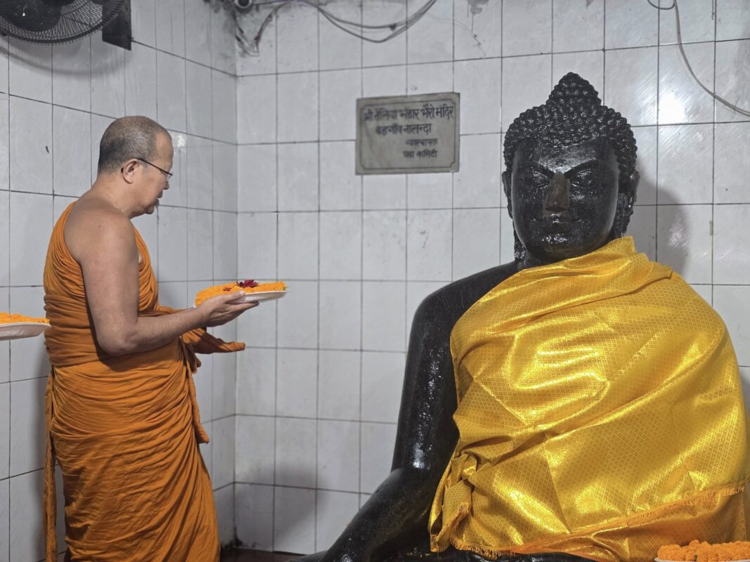 พระพรหมวชิรโพธิวงศ์ เจ้าอาวาสวัดไทยพุทธคยา หัวหน้าพระธรรมทูตสายประเทศอินเดีย – เนปาล นำคณะผู้ร่วมโครงการบรรพชาและอุปสมบทหมู่และปฏิบัติธรรมโรงเรียนนายร้อยตำรวจ สวดมนต์บูชา หลวงพ่อองค์ดำ นาลันทา อินเดีย
