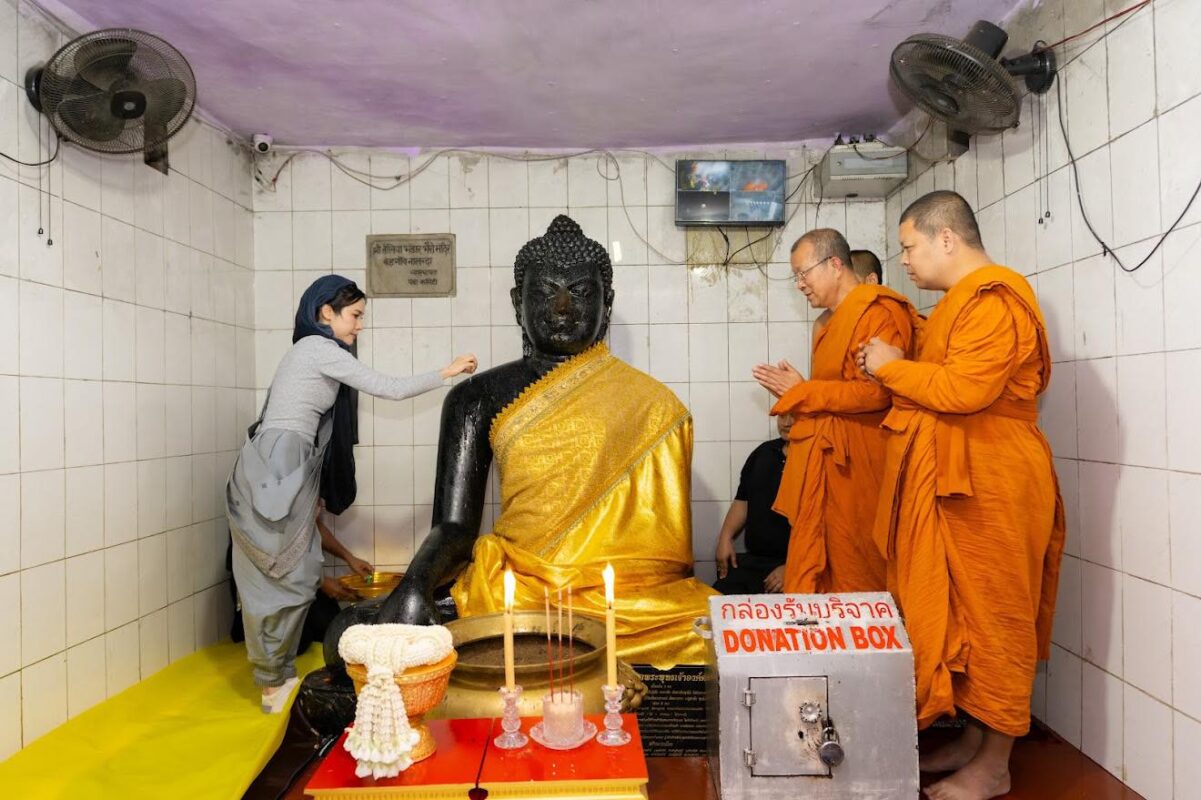 พระพรหมวชิรโพธิวงศ์ เจ้าอาวาสวัดไทยพุทธคยา หัวหน้าพระธรรมทูต สายประเทศอินเดีย – เนปาล เมตตานำ พลโทหญิง เจ้าคุณพระสินีนาถ พิลาสกัลยาณี กราบสักการะวัดพระพุทธเจ้าองค์ดำ พระพุทธรูปองค์สำคัญศักดิ์สิทธิ์แห่งเมืองนาลันทา